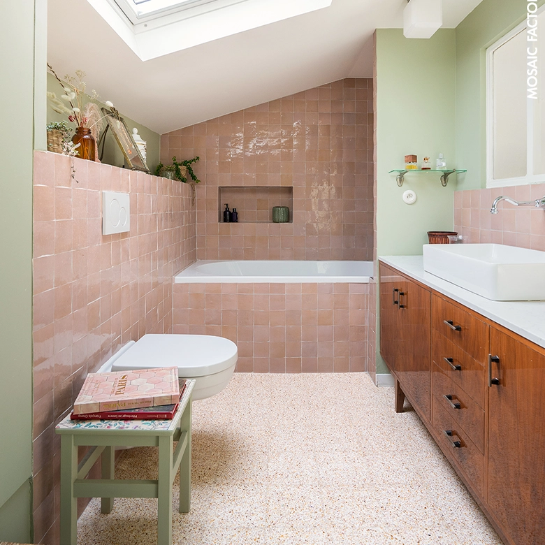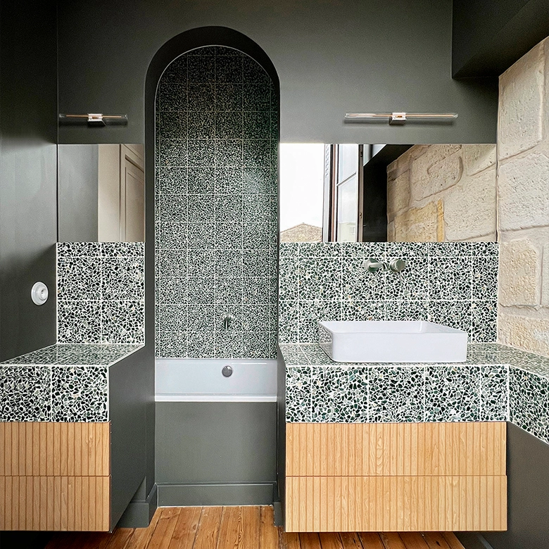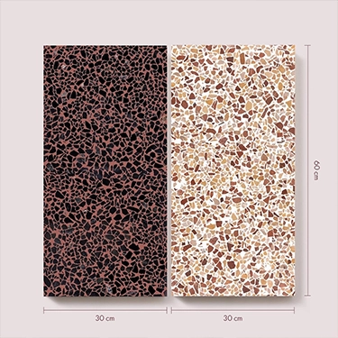 Exemple de terrazzo 60x60 cm - Chaque dalle est unique et présentera de légères variations de motif et de ton.