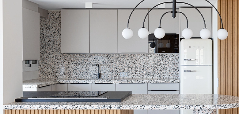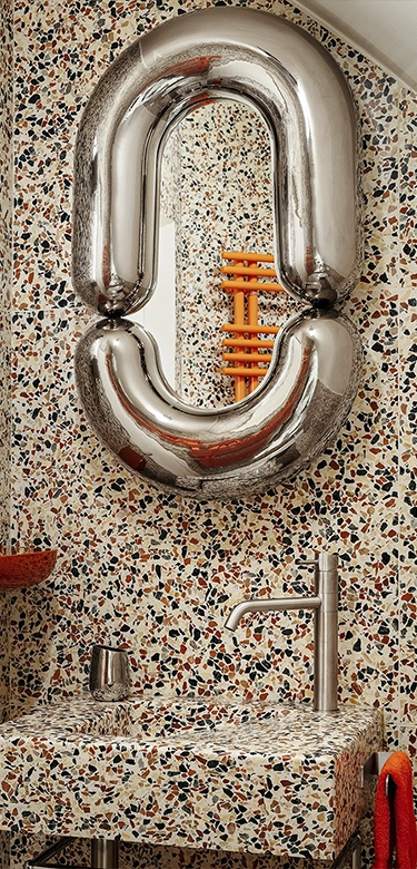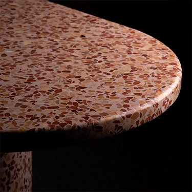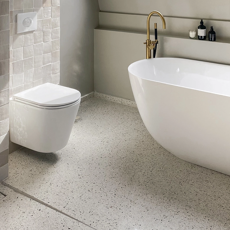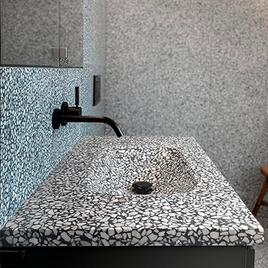 Terrazzo très résistant fait d’un mélange dense de grains de marbre et d’un liant minéral haute performance.